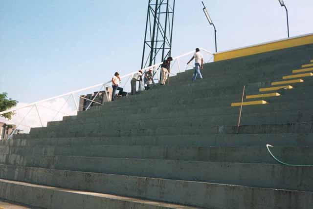 After other waterproofing systems had been tried without success, a total of 6,800 kg (15,000 lb) of Xypex Concentrate was used to completely waterproof the concrete stands of this Valencia stadium. The bottom photograph shows the Xypex application in progress, while the top photograph shows the stands after completion.