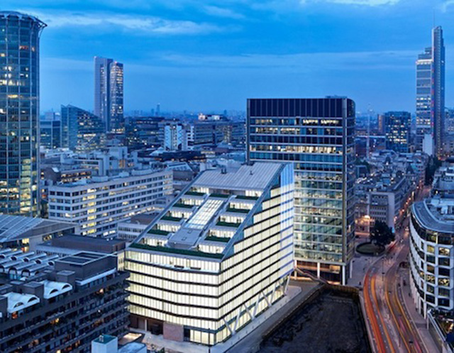 Moorgate Exchange is a striking 344,000 sq. ft. building in the City of London. This commercial development has a green roof, strategic views of St. Paul’s and a two-storey basement. Designed for large city occupiers, the building creates open plan floor plates and six green-terraced stepped back roof garden tiers. Floating on V columns, it is designed to cantilever the floors over the Crossrail tunnel beneath. Materials with sustainable properties, such as recycled aggregates in the concrete, were used in the construction process. Recycled rainwater and grey water storage systems have been installed to reduce the amount of potable water used in the toilets and the irrigation system for the ‘living’ walls on the terraces. The building is one of the first in the UK to achieve both BREEAM Excellent and LEED Platinum ratings.