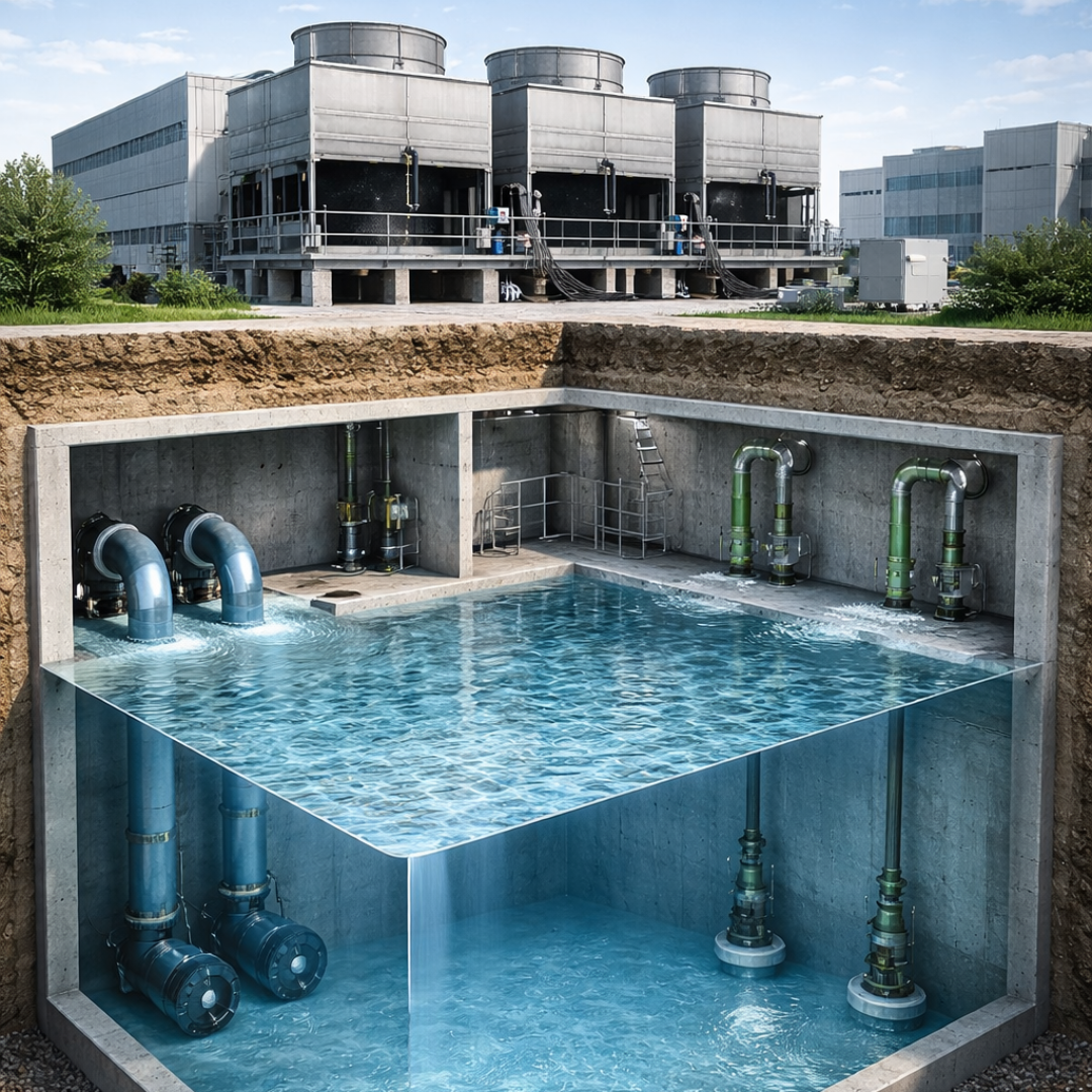 Modern data centers are, at their core, energy-to-heat conversion machines: nearly all electrical power feeding servers and supporting equipment ultimately becomes heat that must be removed and discharged to the environment. In many facilities, that heat is carried away by chilled-water or condenser-water systems and rejected outdoors via evaporative heat-rejection equipment, such as cooling towers. A cooling tower does not “make cool air” for the data hall; it cools a water stream (often condenser water) by evaporating a portion of it into an airstream, and the cooled water is collected in a basin and pumped back to repeat the cycle. Because data centers frequently run at high load around the clock, cooling tower water demand and operational exposure (evaporation, blowdown, drift, and leakage) can persist. As a result, large volumes of water must be continuously circulated, stored, and managed, often in large concrete basins located below grade.