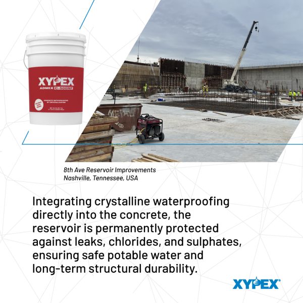 To waterproof Nashville’s largest and oldest drinking water reservoir, built in 1889, Bowen Engineering chose Xypex Admix C-500 NF. By integrating the crystalline waterproofing directly into the concrete mix, the city secured permanent protection from within. This guaranteed a leak-free structure with superior resistance to hydrostatic pressure, all while meeting the strict NSF 61 potable water safety certification. This solution protects clean water with proven, generational durability.