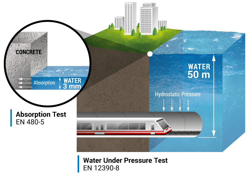 Xypex has published a Technical Note to explain why EN 934-2 Table 9 is appropriate only for the water-resisting admixture category and why a new standard was needed. The Technical Note explains why absorption tests are not suitable for evaluating permeability reduction or for rating integral crystalline admixtures that require water to react, such as Xypex Admix products. It’s the difference between evaluating water absorption on the surface of concrete and water pressure applied to a concrete structure once it is buried underground. Stated simply, absorption tests do not accurately reflect the performance of concrete admixtures designed for resistance to hydrostatic pressure.
