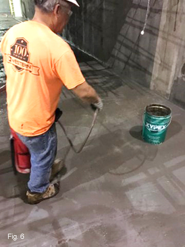 WSC worked in small crews to apply the Xypex waterproofing products (fig. 5 & 6) to nearly 20,000 square feet of interior tunnel surfaces. “Other contractors needed access to the tunnels so we had to kind of work around some of the other trades,” Belgeri says. “We would