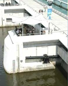 Comprised of nine steel crest gates, each 30 m wide, the barrage spans the 350 m wide Marina Channel, separating seawater from freshwater and acting as a tidal barrier to keep out peak tides. Also forming part of the facility and in the event of a coincidence of heavy rains and high tides, seven gigantic vertical-shaft, axial flow pumps, with a combined capacity of 280 m3 per second will pump excess storm water into the sea.