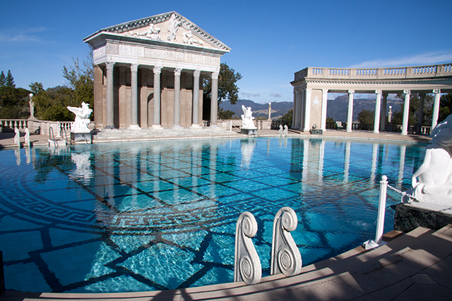 The outdoor Neptune Pool was built and rebuilt three times from 1924 to 1936, primarily to enlarge the pool and to suit its owner’s tastes. The final version of the pool is 104 feet long, 58 feet wide and 95 feet wide at the alcove. It is 3.5 feet deep at the west end, 10 feet at the drains. A highlight of the estate, the pool features fountains, ornamental pools, sculptures, marble pavilions, alabaster lanterns, dressing rooms, and the façade of an ancient Roman temple Hearst imported to California. Other notable aspects include 9,000 square feet of Vermont marble that lines the basin, gutters, and alcove; and four Italian relief sculptures on the sides of the colonnades.