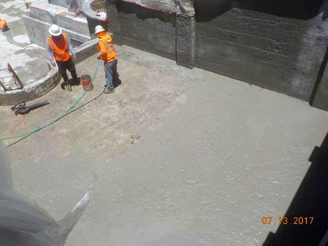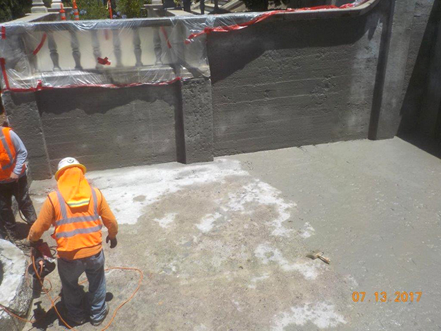 Because the application was performed in 90 degree weather, an overnight sprinkler system was required to prevent the Xypex treatment from drying prematurely. After 14 days the pool was filled with water for leak testing. Upon the initial fill, some leaking was evident but over the course of several days, as the crystalline formation developed within the concrete’s pores and voids, leaks turned to drips and gradually dried up resulting in a waterproof structure.
