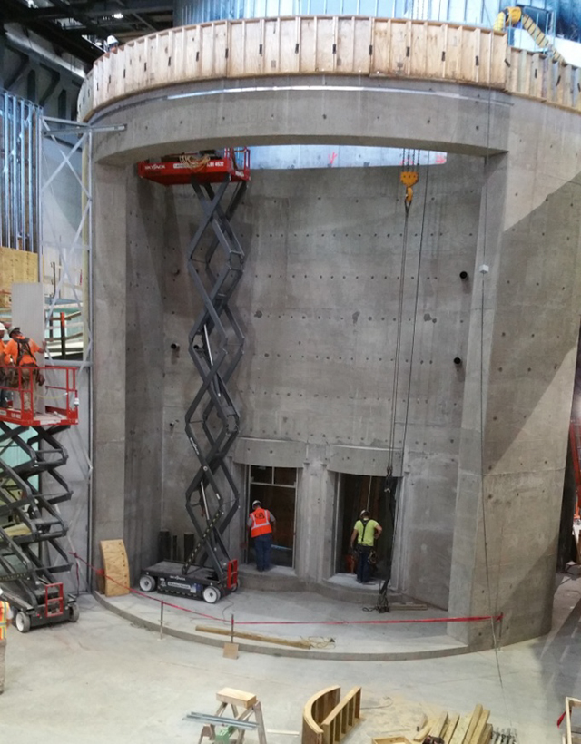 Carson notes that his teams assembled two cranes inside the Great Oceans Hall building to help in form construction and the placement of concrete. The Great Barrier Reef tank (fig 6) required more than 400 yd3 of high strength concrete to form the 18-inch thick steel-reinforced walls. More than 2,000 cubic yards of concrete, treated with Xypex Admix C-500, was used to build the three tanks in the Great Oceans Hall.