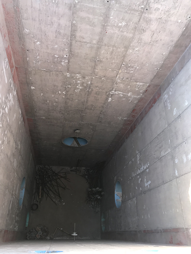 The structure is 12 m (40 ft) deep and situated in an area with a water table that sits at approximately 3.3 m (10 ft) below grade. The walls of the chambers are 900 mm (3 ft) thick and were cast using a taper tie secured, steel gang-forming system. While the concrete work was very good there were some minor imperfections that needed repair. Xypex Megamix II with Bio-San was used for the minor repairs and to fill the 600 taper tie holes. As this high strength repair mortar also contains antimicrobial crystalline technology the repairs received the same MIC, sulfate and chemical resistance as the rest of the concrete treated with Bio-San C500.