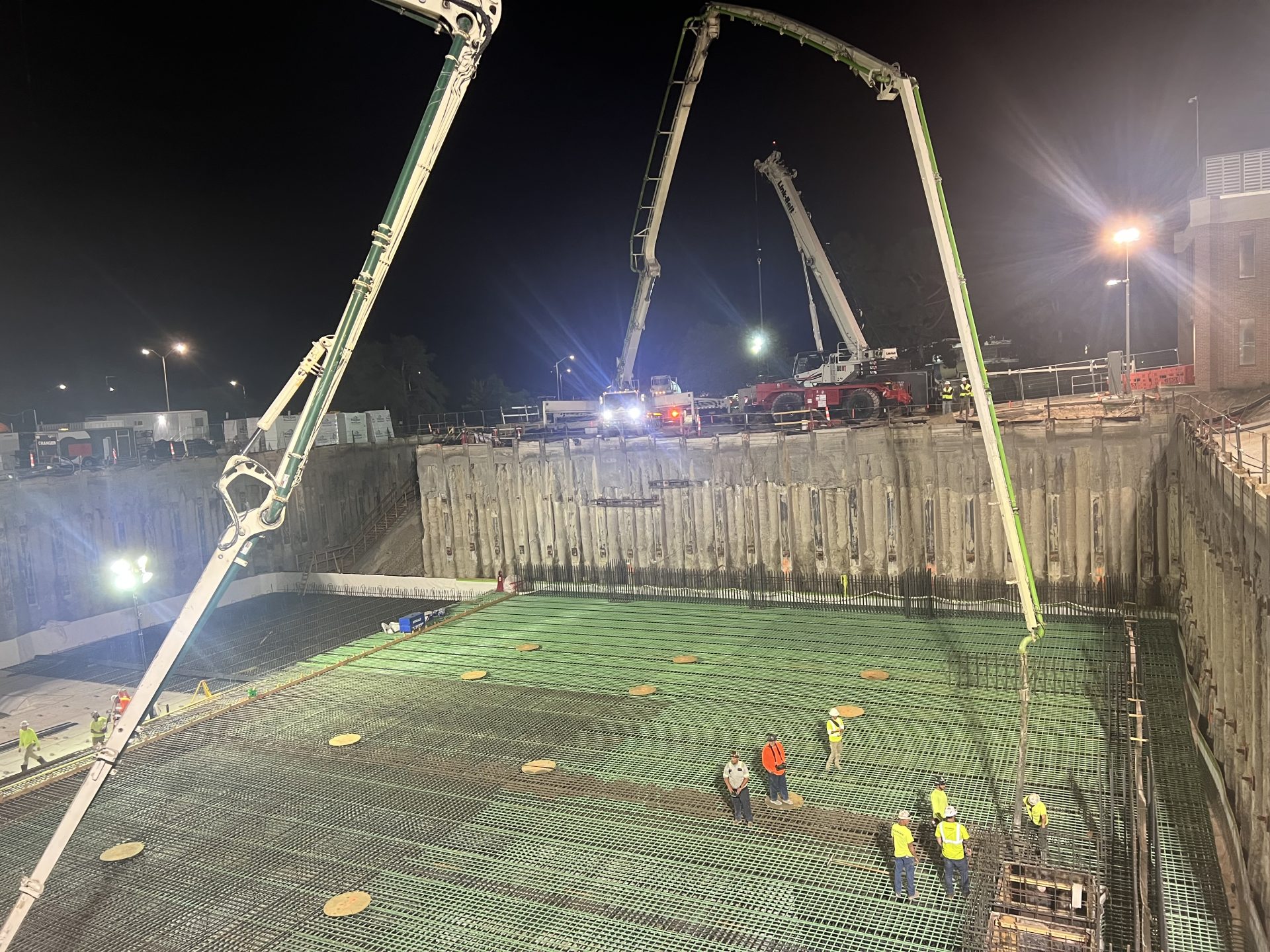 The system incorporates a combination of electric and steam turbine chillers housed within a large mechanical space located four stories below grade. Due to the elevated groundwater table at the site, the below grade concrete structures are subject to sustained hydrostatic pressure. To address these conditions, Xypex Admix C-500 NF crystalline waterproofing admixture was incorporated into the concrete used for the mat slab and below grade walls. Approximately 1,100 bags of Xypex Admix C-500 NF were added during batching.
