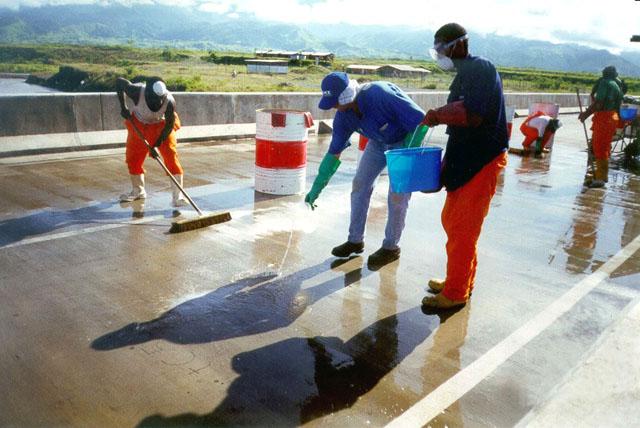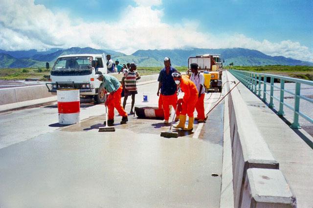 This bridge structure on the Markham Valley Highway showed signs of leeching and water permeation on the soffit of the deck, resulting in fine cracking of the concrete. Xypex Concentrate and Xypex Gamma Cure were selected not only because of their superior waterproofing capabilities but because they could be applied under adverse weather conditions and bridge service would not be interrupted.