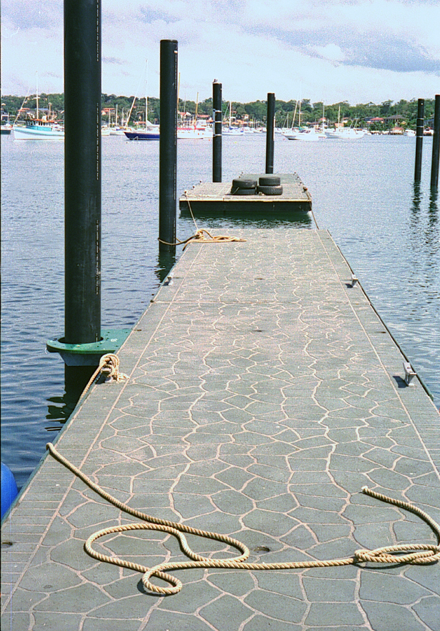 The marina floats were cast in October 1994, employing a high early strength concrete design that incorporated 530 kg of GP cement and 4.2 kg of Xypex Admix C NF Series. The 100 mm thick panels are pre tensioned with wire strands and have foam flotation attached to the soffit. The wire strand steel reinforcing is only 40 mm below the top surface of the concrete panel. The top surfaces of the panels are a nominal 350 mm above sea level.