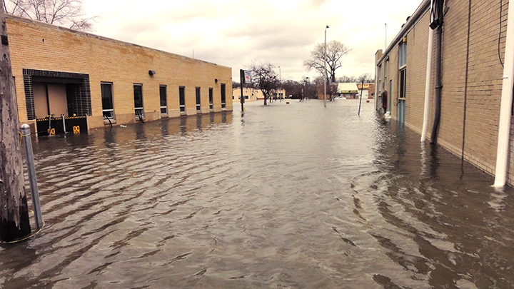 Denman and Bradford-Dice recommended treating the bottom 4 feet of exterior walls with one-half inch of Xypex Megamix II on the outside. Xypex Megamix II is a thick repair mortar ideal for patching and resurfacing concrete. It can be sprayed on or trowel applied. Denman’s team mixed the Xypex Megamix II, which was purchased at RKD Construction Supplies, on site and added a dioxide color to match the existing brick. Then they sprayed it on and troweled it to create a light sand finish. The owner also had flood doors installed throughout. Just one year later the value of Hess’s decision to waterproof was validated. On April 18, 2013, more than 5 inches of rain fell in just 24 hours on already saturated areas in the region. Several days later, the Des Plaines River crested at 10.92 inches, six feet over flood stage. The overflow spread throughout the area including into the commercial business district where Citywide Printing is located. The water in the Citywide Printing area rose to 27 inches high on one side, completely surrounding the buildings.