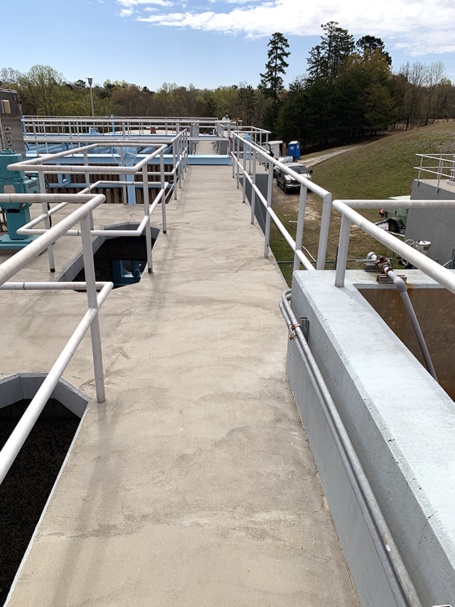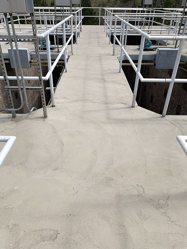The use of FCM 80 as a pedestrian coating system has merit as part of an overall protective and waterproofing approach to horizontal surfaces and should be considered on future projects involving water and wastewater treatment plants and areas where pedestrian traffic is expected. FCM 80 has now shown on both the Raccoon Creek Project in Summerville, Georgia, and here at the Riverside WTP to be an effective approach for waterproofing and providing a non-slip surface as part of a comprehensive strategy addressing the repair and restoration of water and wastewater plants. The use of Xypex FCM 80 for horizontal elements subject to pedestrian traffic is an affective approach.